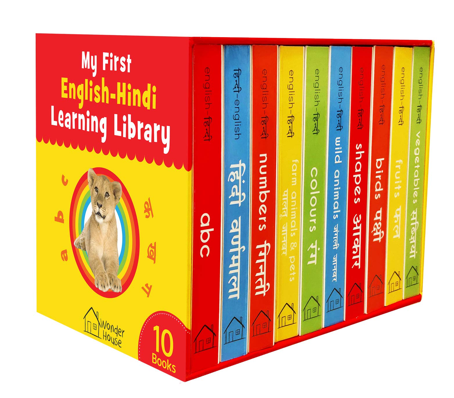 The English-Hindi learning library comprises of 10 Board books to explain basic concepts to little scholars. Well-researched pictures with labels in both Hindi and English makes it easier for the kids to learn concepts faster. These bilingual books cover simple concepts and everyday topics in both the languages to enhance children’s language skills and build a robust vocabulary. The books included in the Boxset are ABC, Hindi Varnmala, numbers, farm animals and pets, colors, wild animals, shapes, birds, fruits, and vegetables.